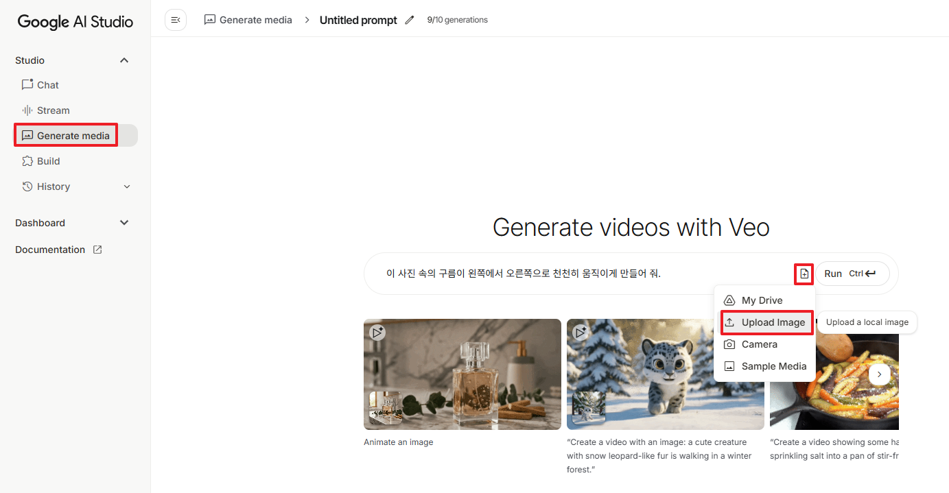 Veo는 텍스트뿐만 아니라, 사진을 업로드해서 움직이는 영상으로 만들 수도 있습니다.